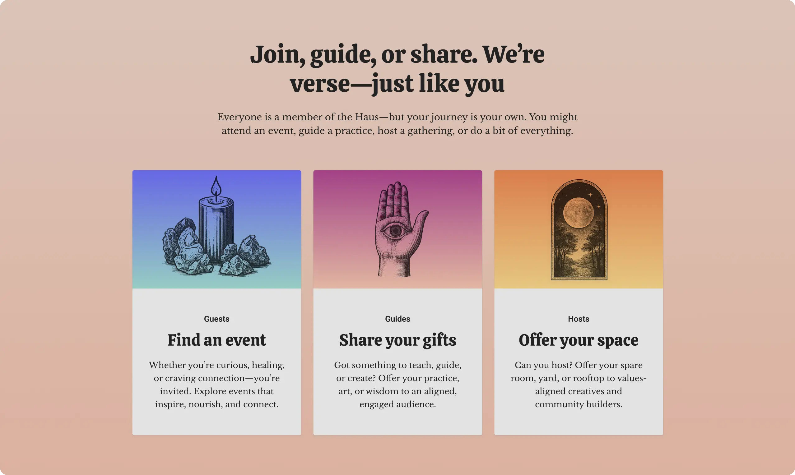 We began by clarifying AwareHaus’ audience. The platform serves three distinct but connected groups—guests, guides, and hosts (those offering physical spaces). We intentionally chose language that felt relational rather than transactional, reflecting the community’s spirit of shared care and creativity.