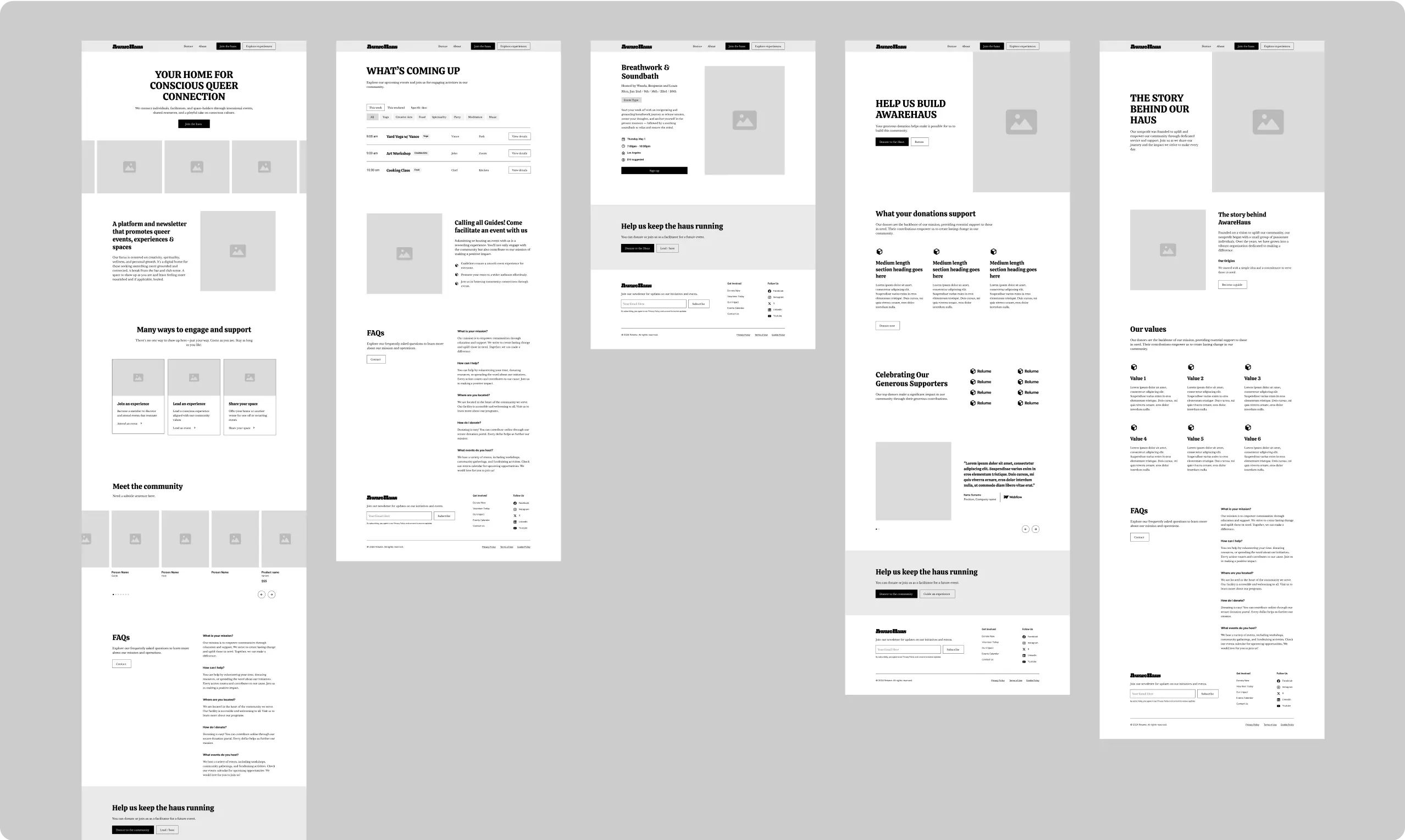When we partnered with AwareHaus in 2025, the organization was evolving from an event newsletter that aggregated community happenings into a full-fledged events platform. They needed a brand and website that reflected that growth — something with a distinct voice and visual identity that stayed true to their queer, playful roots; more clearly defined roles for members; and a custom events platform that felt both intuitive and scalable.